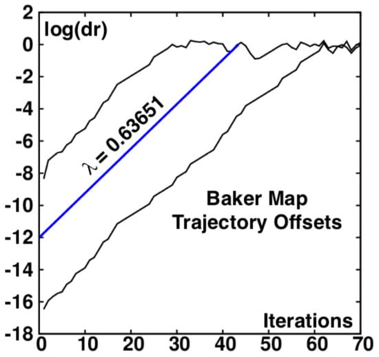 Figure 4 illustrates the exponential character of the expansive northwest-southeast growth by displaying the offset between single- and double-precision simulations, the uppermost of the three curves in the figure. Both simulation types begin at the origin at the center of the diamonds shown in Figure 1, Figure 2 and Figure 3. The initial separation immediately reflects the roundoff error of the single-precision mapping, of order . The single-double separation increases by ten orders of magnitude in about 40 iterations of the map. Similarly, the double-quadruple separation likewise grows exponentially. In that more-nearly-accurate more-precise case the growth rate is the same . is the largest Lyapunov exponent. Its numerical value is 0.63651. The exponent and the blue middle line in Figure 4 drawn with its slope corresponds to averaging the growth rates in the red and white regions, and respectively, taking into account that the white compressive region is twice as likely as the red. The result is the time-averaged expansion rate: