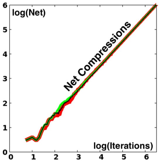 The right side of Figure 3 shows that a stochastic view of the map, traceable to its chaos, is quite proper. Before the mapping shown at the top of Figure 2 is executed we note that the white southeastern area is twice that of the northwestern red area so that compressive steps (into the highest-density lower third of the unit square) are twice as likely as expansive steps (into the upper two-thirds). The preponderance of the excess, lower–upper, is shown in Figure 5 and approaches, on average, as the number of iterations t increases. We would expect the error in this statistical estimate to become visually negligible, say one percent, once the number of iterations is of order . A look at the figure shows that the statistical bumpiness away from a straight line becomes visually negligible between 1000 and 10,000 iterations, just as one would expect for a stochastic, rather than deterministic, process.