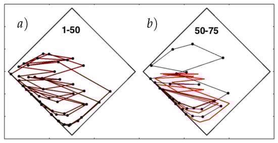 Additional iterations, (a) 1 to 50 and (b) 50 to 75 in double (black) and quadruple (red) precision for the two-dimensional Baker Map B with the initial point at the origin . Lyapunov instability makes the difference between the two solutions visible after about 70 iterations, as can be seen in (b).