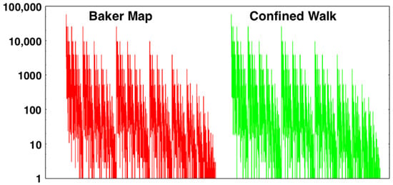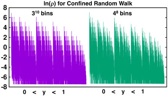 It is an article of faith that the x motion of the map is completely random []. This statistical view is consistent with our numerical work so that we believe it is fully justified. It is easily checked by comparing bin populations for the Map and the Walk after millions or billions or trillions of iterations. See Figure 7 for a million-iteration sampling of 2187 bins for both approaches. Let us consider the confined random walk problem in more detail next [,,].