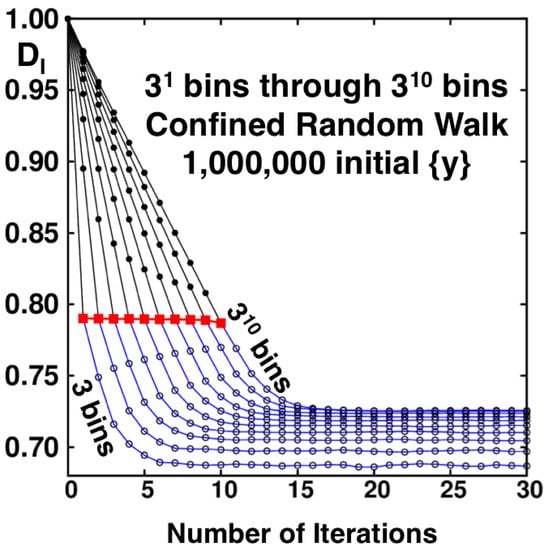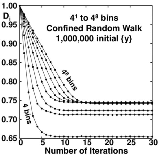 To seek uniqueness both the number of bins and the number of points per bin must approach infinity in averaging the bin probabilities: . To visualize taking this limit we illustrate the result of iterating a set of one million equally-spaced initial points on confined random walks: . We explore thirty iterations: . The confined random-walk iterations are governed by the output of the FORTRAN random number generator randomnumber(r). The dimensionality data are analyzed here using bins, with n varying from 0 to 10. The finest grid has bins of equal width . By combining the contents of 3, or 9, or 27, or…contiguous bins the entire set of 30 stepwise information dimensions for the ten binning choices can be obtained from a single run. The apparent information dimensions for the 300 problems (thirty iterations with ten bin sizes) are plotted as the ten lines shown in Figure 9.