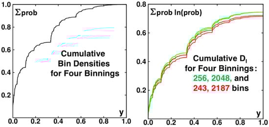 A clearer picture of the binning dependence follows from the cumulative distributions of density and information, shown for the same data used in Figure 8. Figure 11 shows both the density and the information dimension as cumulative sums for two pairs of similar binnings, and . Because the underlying data are identical the densities always agree, within one bin width. The information dimensions are quite different with powers of 2 both giving , significantly greater than and 0.725 for the “natural choice" of powers of three, 243 and 2187 bins. Numerical work suggests that the difference persists even to infinitesimal bin widths.