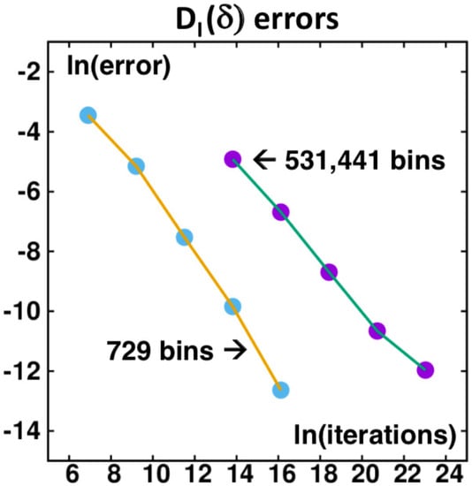 The logarithms of the errors in (due to insufficient iterations) are shown for two different bin widths, at the left and 1/531,441 at the right. For both cases the slope is roughly when plotted as a function of Logarithms of the number of iterations. Thus the error for varies inversely with the number of total iterations included. The data plotted were obtained from 100 successive samplings, corresponding to a parallel computation with 100 independent processors. The leftmost and rightmost points correspond to 1000 and iterations: and .