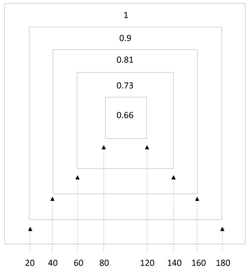 In this work, the new objective is a case where the sites are not removed with equal probability, in contrast to the classical case, so as to reach the critical point, but instead they are removed, in each shell of the lattice, with different removal probabilities; specifically, with a higher probability, the closer they are to the periphery of the lattice, and with a lower probability, the closer they are to the center of the lattice. Thus, the lattice is divided into several shells (zones), each shell having a different probability for the removal of a site. An example is shown in Figure 1, where the lattice is divided into five (5) square shells. Each site of the lattice belongs to one of those shells, according to its distance from the center. The lattice shown in Figure 1 is of size 200 × 200, and the boundaries of the five shells are marked. Inside each shell is denoted the probability of removal of a site, when chosen. Using a uniform random number distribution, we select an occupied (filled) site of the lattice. That site will be removed with probability denoted in the corresponding shell. If the site is not taken out then a new site is chosen. Whenever the site is removed, we check with the CMLT algorithm [14] whether the largest cluster percolates. The criterion used is that sites at all ends of the lattice, either up/down or right/left, belong to its largest cluster, i.e., are all connected. Thus, in the current work we remove sites one-by-one and we identify the critical point exactly when the largest cluster seizes to percolate. We then calculate the density of the still-remaining occupied sites, which gives us the percolation threshold of this Monte Carlo realization. This procedure for sequentially removing occupied sites with a certain probability is repeated until the critical point is reached. In the present case, where the probabilities for removal are different, we expect the pc to differ from the “normal” (non-shelled square lattice) percolation threshold (pc = 0.5927) [10].