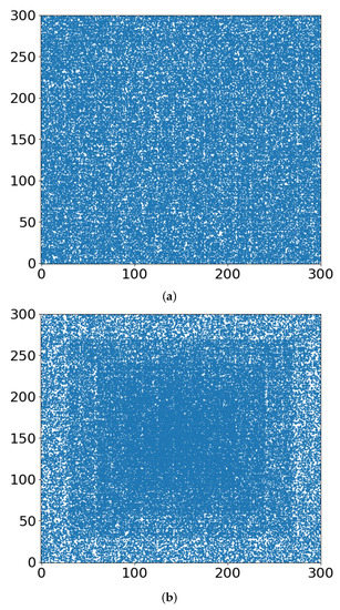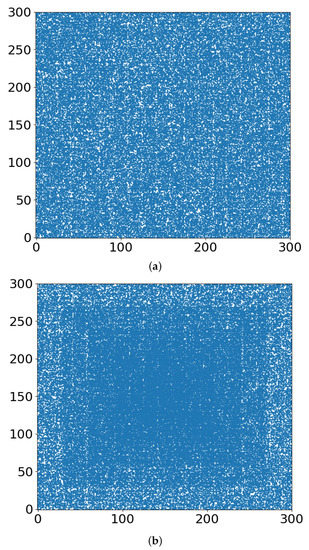 Occupied sites of the lattices at p = 0.5900 for (a) r = 0, (b) r = 0.4.