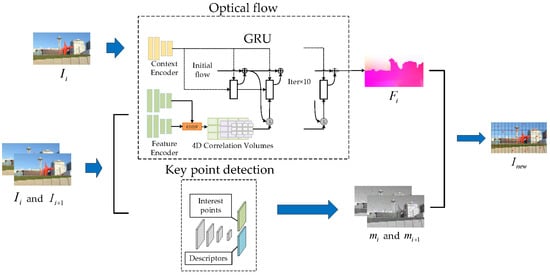 This stage is divided into two parts, one involves using SuperPoint to detect key points and return the matched key points, and the other involves using RAFT [23] to generate the optical flow iteratively. The stage is illustrated in Figure 2. This optical flow is then combined with the key points returned by SuperPoint to complete the tracking of the key points.