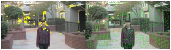 Complex video (moving foreground): the left shows the distribution of key points obtained using the traditional manual method and the right shows the distribution of key points obtained using SuperPoint.