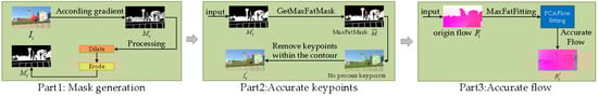 The second stage mainly involves obtaining accurate key points and optical flow, as well as obtaining the trajectory of the keypoints. This stage is divided into two parts. One is related to obtaining the accurate alignment, and the other is related to obtaining the motion trajectories. The accurate alignment portion of this stage includes the generation of the mask, ensuring the precision of the key points and the precision of the optical flow, as shown in Figure 5.
