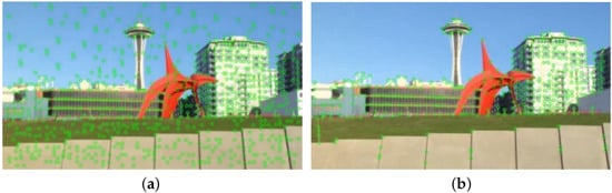 Accurate key points: (a) shows key-point detection using SuperPoint only and (b) shows the distribution of key points after removing the flat areas.