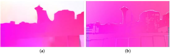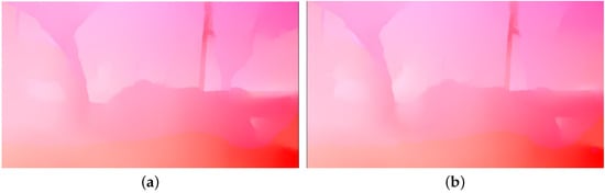 The unprocessed optical flow is shown in Figure 7a. It can be noted that the optical flow within the untextured area is not consistent with that in the textured area, which will distort the generated frame in the local region. Next, PCAFlow [24] is used to fill in the optical flow in the removed area based on the optical flow in the unremoved area, so that the motion of the frame tends to be consistent and an accurate optical flow is obtained, as shown in Figure 7b.