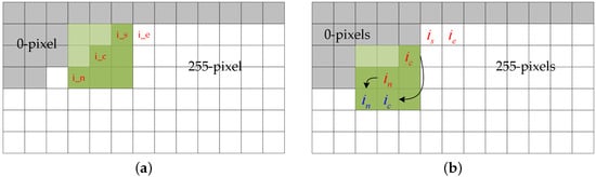 Step3: Contouring the white area of the “binary image”. This step involves finding the connected domain in the “binary image” with a pixel value of 255, and the same idea is used in the work of Satoshi et al. [25]. In a binary image, when the pixel values between adjacent pixels are different for the first time, this isconsidered to be the start of the boundary and is uniquely encoded to deal with the problem of creating multiple boundaries. When you find the the start-point , then you look for the end-point , which is used to determine whether the contour has ended.When the current point is found to belong to the contour, it is currently the center point . In the process of tracking, we look for the next point belonging to this contour in the 8-neighbourhood of the center point, which is the latest point, . and are continuously iterated and replaced to complete the generation of the boundary, as shown in Figure 9.