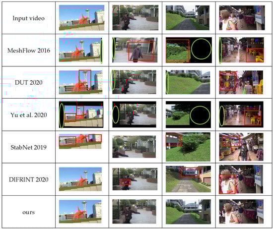 Table 2 shows a comparison of the distortion ratio. Our model, using the NUS dataset, resulted in less distortion. Compared with MeshFlow’s transform based on global homography [1], the transform based on the foreground and background separation introduced less distortion. Compared with DUT [14], which also uses a DNN-based key-point detector, the problem of key-point redundancy caused by a large untextured area was considered in our experimental process, and the key points in a large untextured area were removed. Furthermore, PCAFlow was used to fit the optical flow, which introduced less distortion. Compared to StabNet [16] which also generates stable frames based on grids, StabNet [16] was not unsupervised and DeepSta datasets were used in the training. This dataset is too small and contains a single scene, so the training was not accurate enough. Compared with the method of Yu et al. [15], which also filled the flat area, Yu et al. [15] filled the boundary between the untextured area and the textured area for a second time, which was overfilled and also produced deformation and distortion. When the object in the video was too close to the camera or had a large occlusion or there were too many people in the video, the motion trajectory optimization method of Liu et al. [5] did not follow its motion trend, resulting in poor results, including distortion and artifacts.