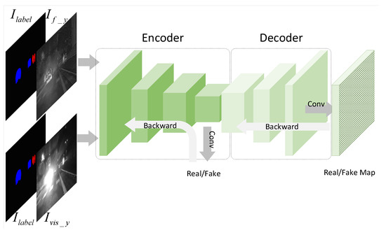 The luminance channels of the visible image and the fused single image are fed into the encoder in an unpaired manner to build a generative and adversarial structure. To obtain the global and local discrimination between the visible image and the fused image, and enhance the performance of the fused images on structure and textures, the perceptual discriminator employs a conditional U-shaped network with attention to detail and local structural information. The conditional discriminator utilizes the segmentation label as the condition in the discrimination of the visible image and the fused image to ensure the correspondence of the semantics. In addition, the U-shaped discriminator makes strong spatial discrimination [17]. The structure of the Perceptual discriminator is shown in Figure 3.