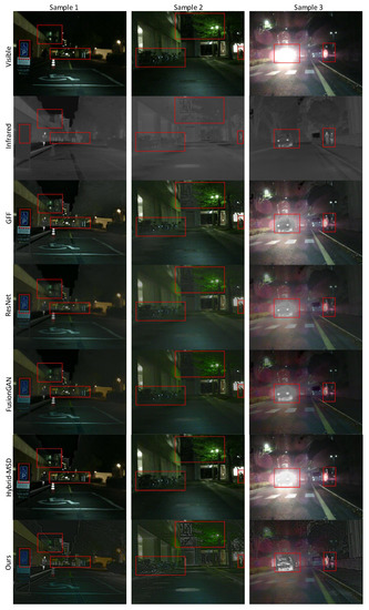 The sample 3 in Figure 4 shows a strong light scene at night. In visible light, pedestrians, cars and other targets cannot be seen due to the presence of glare. In our fusion image, the car and the person in the car are more salient than in other fusion methods, and the person on the right is also more salient. In other fusion images, it is almost difficult to distinguish the car, the person in the car, and the person on the right. It can be seen that the significant advantage of our target prominence in the fused image is obvious in the strong light scene. On the contrary, in other methods, the target in the glare scene loses some infrared information, and less target information is retained, and it is even difficult to identify the target.
