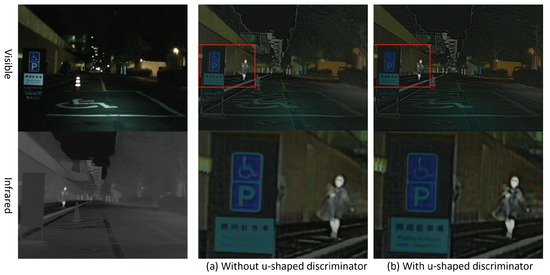 From Figure 5, we observe that our fused image offers more visible detail information when using a U-shaped discriminator. For example, the details of the billboard and light in the visible image are well-retained when we use the U-shaped discriminator. This shows that our U-shaped discriminator enhances the visible detail of fused images and the visible perception of the image to a certain extent. Obviously, the detail of the pedestrian is also rich with a U-shaped discriminator.