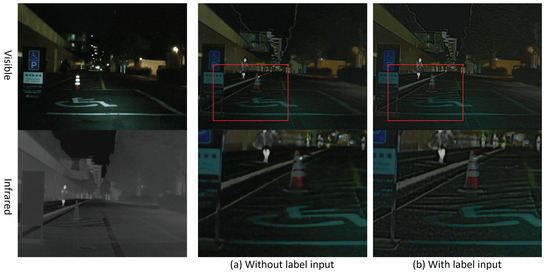 After the conditional discriminator is added, the objective indicators , , , and are improved, which means that the fused image contains more information and the image fusion effect is improved. From Figure 6, it is clear to see that the contrast of the ground is significantly enhanced and the detail information is richer when the conditional discriminator is used. This indicates that the segmentation labels added as a prior knowledge can optimize the spatial distribution and improve the perceptual capability of the fusion network.