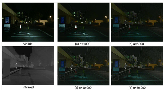 It is obvious that when the hyperparameters are small, there are more visible details in the fused images, but the targets with distinct IR thermal features are significantly blurred, which means less IR salient information. As gradually increases, the semantics of the segmentation network gradually guides the progress of fusion, and more IR image components containing salient semantic information are added to the fused image. However, when is larger, the detail loss of the visible image is larger, and more infrared information makes the fused image blurred. Therefore, we need to reasonably adjust the hyperparameter to keep a balance between the detailed information of the visible image and the prominent information of the infrared image. Based on the experimental results, we choose = 10,000 to balance this relationship.