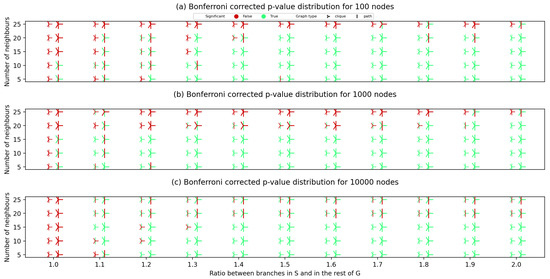 The distribution of Bonferroni-corrected p-values for different randomly generated synthetic graphs with 100 (a), 1000 (b) and 10,000 (c) nodes. The x-axis shows the node module contrast (the ratio between branch weights in the planted S module and in the rest of the graph). The y-axis displays the average number of neighbouring nodes for each node (average unweighted node degree). Smaller marker relates to the S node set with five nodes in (a,b) and 50 nodes in (c), while the larger stands for S with 10 nodes in (a,b) and 100 nodes in (c). “|” marker corresponds to the case when a path graph is planted, while “Y” corresponds to the case where a clique is planted via S. A p-value is considered significant if it is lower than 0.05.