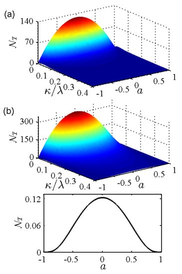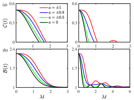 Figure 1 shows the non-Markovianity of a two-qubit system interacting with nonequilibrium environments as a function of the environmental memory decay rate and the nonstationary parameter a. Similar to the case of a single qubit system coupled to nonequilibrium environments, for a given value of the environmental memory decay rate , the non-Markovianity shows symmetrical behavior for positive and negative environmental nonstationary parameter a in both weak and strong coupling regimes. As the environmental nonstationary parameter a deviates from zero for a given environmental memory decay rate , the non-Markovianity decreases due to the suppression in the dynamical decoherence induced by the environmental nonequilibrium feature. In both weak and strong coupling regimes, for a given value of the environmental nonstationary parameter a, the non-Markovianity increases with the decrease in the environmental memory decay rate . The non-Markovianity decreases to zero as the environmental memory decay rate increases in the weak coupling regime, as shown in Figure 1a, whereas it does not decrease to zero in the strong coupling regime as displayed in Figure 1b.