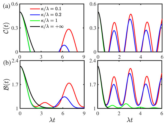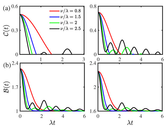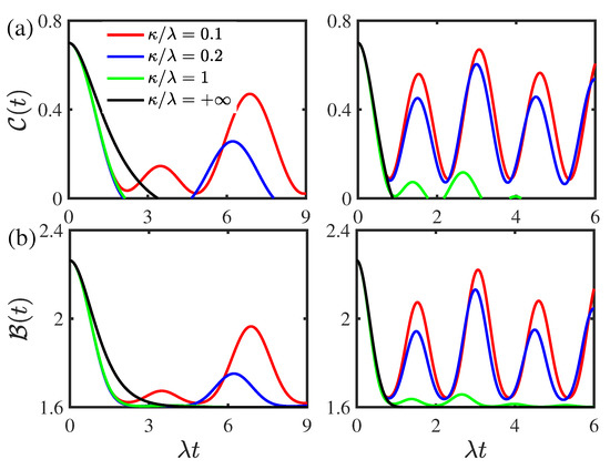 Figure 8 shows the time evolution of the concurrence and Bell function for different values of the coupling strength for the two-qubit system prepared initially in the composite Bell states and Werner states, respectively. As displayed in Figure 8a, for the weak coupling case (small ), the entanglement shows sudden death phenomenon; as the coupling strength increases, the entanglement rebirth phenomenon occurs for the two-qubit system initially prepared in the composite Bell states and Werner states. The threshold values corresponding to the entanglement rebirth phenomenon in the composite Bell states and in the Werner states are and , respectively. In addition, as the coupling strength increases, the entanglement revivals in the concurrence become more obvious. This indicates that the coupling strength can enhance quantum entanglement. As shown in Figure 8b, the Bell function undergoes a transition from quantum nonlocality to classical nonlocality for the two-qubit system initially prepared in both the composite Bell states and Werner states. Furthermore, the Bell function decays monotonically and nonmonotonically for small and large values of the coupling strength , respectively. The Bell function decreases as the coupling strength increases. This reflects that the coupling strength can suppress nonlocality.