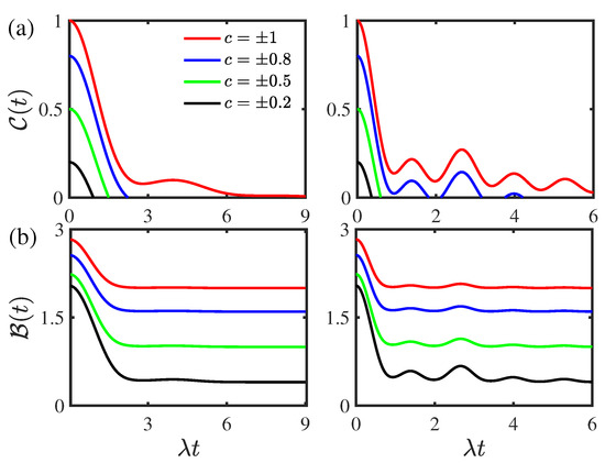 Due to the pure decoherence, the diagonal elements of the reduced density matrix are time-independent and the off-diagonal elements decay with time monotonously (Markovian behavior) or non-monotonously (non-Markovian behavior). According to the two-qubit Kraus operators expression for the reduced density matrix in Equation (17), the diagonal elements do not evolve with time