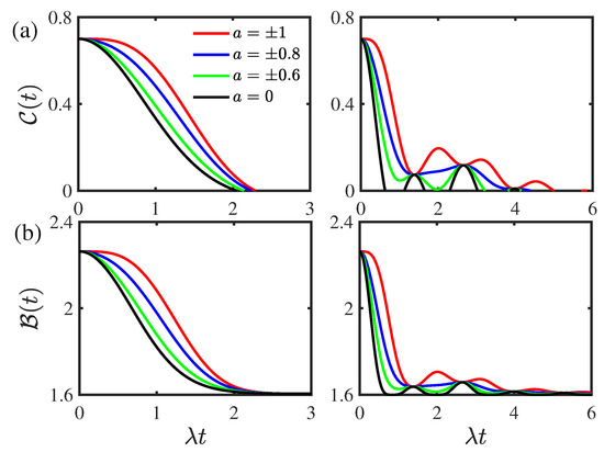 Figure 2 displays the time evolution of the concurrence and the Bell function for different values of the environmental nonstationary parameter a for the two-qubit system prepared initially in the composite Bell states. As shown in Figure 2a, the concurrence decays monotonically and there is an entanglement of the sudden death phenomenon in the weak coupling regime for both the nonstationary and stationary cases. In the strong coupling regime, as the nonstationary parameter increases, the concurrence undergoes a transition from monotonical decay to nonmonotonical decay with nonzero entanglement revivals. When the nonstationary parameter is smaller than a certain threshold value , the entanglement only displays sudden death phenomenon and the rebirth phenomenon disappears. In both the weak and strong coupling regimes, the concurrence increases as the environmental nonstationary parameter a departs from zero. This indicates that the environmental nonequilibrium feature can suppress the disentanglement dynamics. As displayed in Figure 2b, in the weak coupling regime, the Bell function decays monotonically, whereas it shows nonmonotonical decays in the strong coupling regime. In both the weak and strong coupling regimes, the nolocality undergoes a transition from quantum to classical and it increases as the environmental nonstationary parameter a departs from zero. This reflects that the environmental nonequilibrium feature can enhance the quantum nonlocality. In addition, the environmental nonequilibrium feature does not influence the initial values of the concurrence and Bell function in both the weak and strong coupling regimes for the system prepared in the composite Bell states initially.