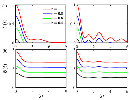 Figure 7 displays the time evolution of the concurrence and Bell function for different values of initial purity state parameter r for the two-qubit system prepared initially in the Werner states. As shown in Figure 7a, similar to the case that the two-qubit system initially prepared in the composite Bell states, as the initial purity state parameter r decreases from the threshold value , the entanglement sudden death phenomenon occurs in the weak coupling regime. In the strong coupling regime, the entanglement displays sudden death and rebirth phenomena, and it only shows sudden death phenomenon; the rebirth phenomenon disappears as the initial purity state parameter r is smaller than the threshold value . With the increase in the initial purity state parameter r, the concurrence increases in both the weak and strong coupling regimes and the entanglement revivals in the concurrence become obvious in the strong coupling regime. This reflects the fact that the initial purity state parameter r can enhance quantum entanglement. As shown in Figure 7b, the Bell function decays monotonically and nonmonotonically in the weak and strong coupling regimes, respectively. In both the weak and strong coupling regimes, the Bell function increases as the initial purity state parameter r increases. This indicates that the initial state parameter can enhance nonlocality. As the initial purity state parameter r decreases from the threshold value , it first undergoes a transition from quantum nonlocality to classical nonlocality and then it only displays classical nonlocality when the initial purity state parameter r is smaller than the threshold value due to the fact that the initial Bell function is not always larger than the threshold for the two-qubit system prepared initially in the Werner states. This is quite different from the case that the two-qubit system prepared initially in the composite Bell states.