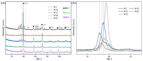 The XRD patterns of the RHEAs are depicted in Figure 1. It can be seen that the RHEAs are not single-phase but have multi-phase structures. Further analysis has shown that the RHEAs consist of three phases: the main BCC phase, Laves phase (V2Zr), and Zr-rich HCP phase. By amplifying the (110) diffraction peak of the BCC phase (Figure 1b), it can be seen that with the increase in W content, the diffraction peak gradually moved to a higher diffraction angle, indicating the occurrence of lattice distortion. The experimental and theoretical lattice constants of the BCC phase are listed in Table 3. The results indicate that the lattice constant of the BCC phase decreased gradually with the increase in W content. This may be caused by the reduction of the total atomic radius of the RHEAs due to the introduction of more W elements with a smaller atomic radius. This result is consistent with the result that the (110) diffraction peak shifted to the higher diffraction angle, as shown in Figure 1b. Intriguingly, both the experimental and theoretical lattice constant values exhibited similar decreasing trends. The theoretical values are slightly larger than the experimental values, which suggests that some ordered phases may be formed in these RHEAs [42]. This result can also verify the existence of Laves phase. Based on the rule of mixture, the theoretical lattice constant, amix, of RHEAs can be estimated as [42]: