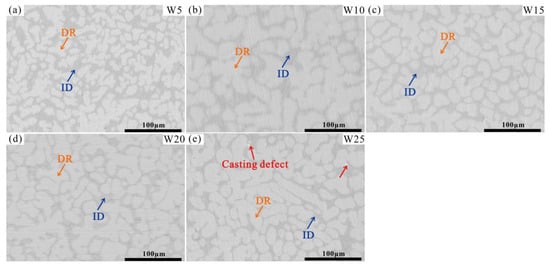The microstructures of the Wx(TaVZr)100−x RHEAs are shown in Figure 2. The SEM images of the RHEAs mainly show two regions: white regions and gray regions, representing dendritic regions (DR) and interdendritic regions (ID), respectively. The microstructures of RHEAs changed significantly with the increase in W content. W5 RHEA mainly manifested slender dendrites, and most of them were small-sized dendrites (Figure 2a). With the increase in W content, the dendrite shape of the W10 RHEA became coarser, and the dendrite size also increased (Figure 2b). Moreover, for these two RHEAs, the distribution of dendrite structure was loose, leaving more interdendrites. With a further increase in W content, the microstructures of the W15, W20, and W25 RHEAs were mainly composed of dendrites of different sizes, and the distribution of dendrites was denser when compared with the W5 and W10 RHEAs, as shown in Figure 2c–e. The Image J software was further used to calculate the volume fractions of ID regions, where 39.45%, 36.29%, 34.17%, 32.28%, and 30.51% for W5, W10, W15, W20 and W25, respectively, were observed, as shown in Figure 3. The element distribution results for RHEAs (Figure 4) show that the W and Ta elements were mainly concentrated in DR regions, while the V and Zr elements were mainly concentrated in ID regions. The results indicate the occurrence of element segregation, which is common in as-cast RHEAs [4,46]. The main reason for this could be that during the solidification process, elements with a high melting point tend to solidify first to form DR regions, while and elements with a low melting point will then solidify to form ID regions [46].