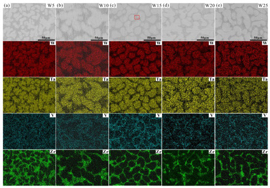 EDS mapping results showing the element distributions of the Wx(TaVZr)100−x RHEAs: (a) W5, (b) W10, (c) W15, (d) W20 and (e) W25.