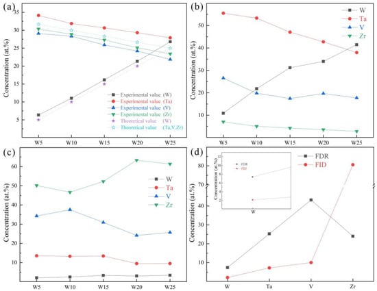 The chemical compositions of the RHEAs are given in Figure 5a, and their detailed chemical compositions are listed in Table 4. It can be seen that the W and Ta contents were slightly higher than the theoretical values, while the V and Zr contents were slightly lower than the theoretical values. This may be caused by element segregation during the solidification process, where the solidification sequence of different elements is distinct, resulting in different element contents at different positions in the RHEA ingots. The slight volatilization of low melting point elements (V and Zr) during the melting of RHEAs may also be responsible for this result. Furthermore, the chemical compositions of DR and ID regions are depicted in Figure 5b,c. For the W5, W10, and W15 RHEAs, the W content in the DR region is about twice its theoretical value.