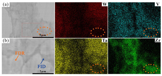 EDS mapping results showing distributions of W, V Ta, and Zr elements at the area indicated by the red rectangle in Figure 4c, where (b) shows the rectangles in (a) at a higher magnification.