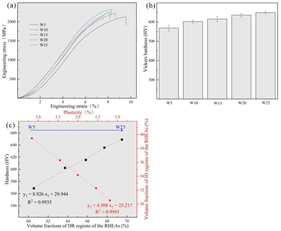 (a) Compressive engineering stress–strain curves at RT; (b) Vickers microhardness of Wx(TaVZr)100−x RHEAs; and (c) the relationships among the hardness and volume fractions of DR regions, plasticity, and the volume fractions of ID regions.