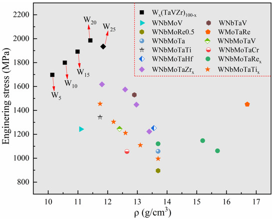 In order to compare the mechanical properties of the designed Wx(TaVZr)100−x RHEAs with other RHEAs in the literature, the mechanical properties and densities of tungsten-containing quaternary RHEAs [46,49,50,51], typical WNbMoTa RHEA [1], WNbMoTa-X (X represents other metallic elements) RHEAs [1,2,31,42,52,53], and the present RHEAs are given in Figure 8. The theoretical density of RHEAs can be obtained using the rule of mixture and expressed by following equation: