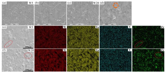 SEM images of the surface of RHEAs after compression tests, where (a–d) are the W5 and W20 RHEAs, respectively. The corresponding element distributions of W5 and W20 RHEAs at relatively higher magnifications are shown in (e,f), respectively.