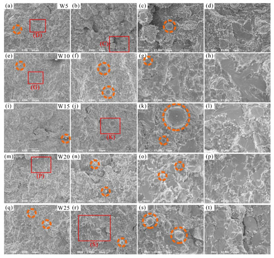 SEM images showing the fracture morphology of the prepared RHEAs after compression tests: (a–d) W5; (e–h) W10; (i–l) W15; (m–p) W20, and (q–t) W25, where (c,d,g,k,p,s) are the magnified images of the red rectangles C, D, G, K, P, and S, respectively.
