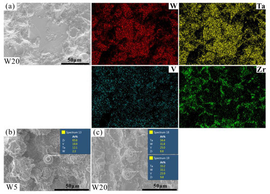 EDS mapping results showing the elemental distributions of the fracture surface of W20 RHEA (a) and the chemical composition of the molten droplets on the fracture surface, where (b,c) are W5 and W20 RHEAs, respectively.