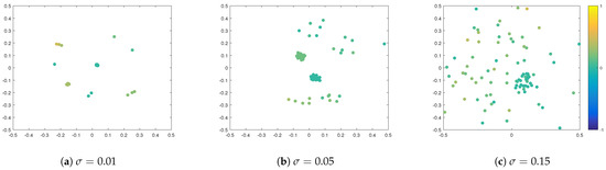 First, we consider the case of additive noise, where we assume that , and we distinguish between different noise strengths, namely , , and . We fix the interaction radius and include strong opinion influence and strong spatial influence . In Figure 1, we plot simulation snapshots at the final time for these different values of , where agents’ positions correspond to their positions in a social space, and agents’ colours indicate their opinions. We observe a strong influence of noise on the cluster-formation process. Namely, the higher the , the denser the inter-cluster connections are, such that, for , there is no clear separation into different clusters, neither in the social nor in the opinion space. This can be seen in Figure 2 of opinion trajectories of individual agents. Additionally, stronger noise in the system leads to more diversified opinion distributions when reaching consensus, as can be observed in the final distribution of agents’ opinions in Figure 3. For small values of noise, i.e., , the system reaches a stable state, and we see several spatially separated clusters of agents that are stable, and, within each cluster, agents have similar opinions. This behaviour has been observed in previous studies of network models [22,43].