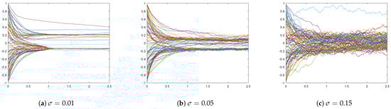 Opinion trajectories of agents over time-period for different influences of additive noise: (a) , (b) , and (c) . Other parameters are fixed to and .