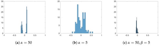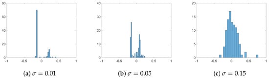 Distribution of agents’ opinions at final time for different influences of additive noise: (a) , (b) , and (c) . Other parameters are fixed to and .