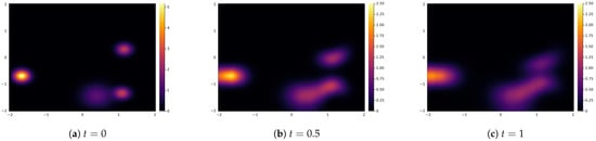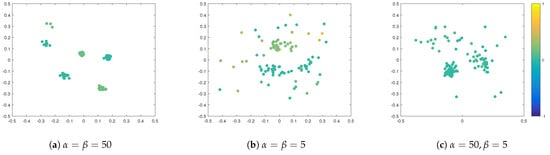We run stochastic simulations for agents, where, at , all agents are placed uniformly at random inside , and their initial opinions are distributed uniformly in the interval . We run each simulation for 250 time-steps, i.e., until , where . In every time-step, movement of agents and their opinions are obtained using a Euler—Maruyama scheme [41,42].
