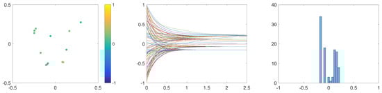 Results of one simulation of the ABM with multiplicative noise, for and . (Left): Snapshot of the dynamics at . (Middle): Opinion trajectories during . (Right): Distribution of agents’ opinions at . Positions of agents indicate their positions in a social space. Colours of agents denote their opinions according to the colour-bar. Other parameters are fixed to and .