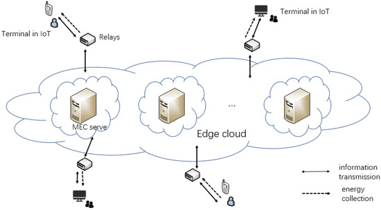 - Considering the characteristics of MEC’s data processing capacity and SWIPT’s energy collection, a multi-terminal, multi-relay, and multi-server edge offloading and selection architecture with the advantages of MEC and SWIPT is designed. The MEC server can provide high-speed computing services, but it also has computing costs;