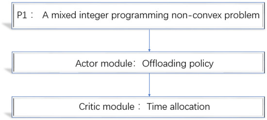 The problem involves combinatorial mode selection variable , which has possibilities when it comes to offloading policy. Therefore, the problem is a hard mixed integer programming non-convex problem and is difficult to address. However, we observed that two variables of are jointly concave. Once offloading policy is given, the problem can be transformed into a convex problem, , which concerns time allocation. In order to solve the problem, this paper converts the problem into two subproblems: offloading policy and time allocation [21], as shown in Figure 3.