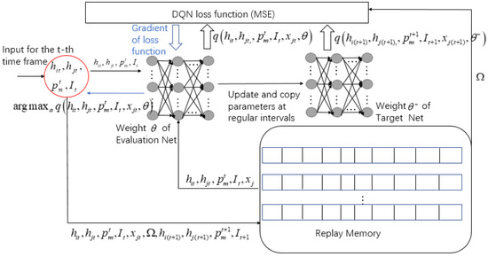 The replay memory has a limited capacity. When the memory is full in the t-th time frame, the newly generated data pair is stored and the old data pair is discarded. A batch of training samples are randomly sampled from the memory using the experience replay technique. is the time index of the sampling sample. The DNN is trained every time frame, and the parameters of DNN are continuously updated to generate a new and accurate offloading policy. updates by applying the Adam algorithm [30]. The loss function is expressed as: