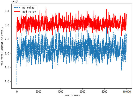 Figure 10 compares the total computing rate of the system with the relay and the system without the relay. As is shown in Figure 10, the total computing rate after adding the relay is better than that without the relay. The simulation verifies that adding the relay not only expands the communication range but also improves the computing rate of the system significantly. It proves the necessity of adding relay equipment.