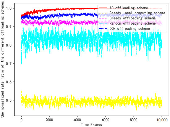 Then, the computing rates of five offloading schemes are substituted into Equation (14) for normalized ratio rate comparison. Figure 14 compares the computing rate of the AC offloading scheme, the DQN offloading scheme, the greedy offloading scheme, the greedy local computing scheme and the random offloading scheme with the benchmark rate.