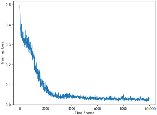 Figure 13 shows the training loss of DNN in the actor module. As is shown in Figure 13, the training loss gradually decreases and stabilizes around . There are fluctuations in the loss values in the graph. This is mainly due to the random sampling of training data and does not affect the DNN’s effectiveness.