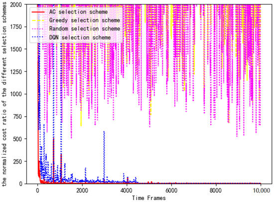 It can be clearly seen that the AC selection scheme and the DQN selection scheme are significantly better than the other schemes in Figure 17. In the early stage, the costs of the AC selection scheme and the DQN selection scheme are 2000 times that of the benchmark scheme. With the training of the DRL algorithm, the AC selection scheme and the DQN selection scheme quickly reach the optimal cost and maintain long-term stability. However, it can be seen that the computing cost of the DQN selection scheme is higher than that of the AC selection scheme because the former uses the q-value function in the algorithm iteration. Compared with the greedy selection scheme, the random selection scheme is better due to its randomness. However, there is still a significant performance gap compared with the AC option and DQN option. Because the time-varying price factor is not considered, the cost fluctuations of the greedy selection scheme and random selection scheme are about 1000–2000 times that of the benchmark scheme. Compared with the benchmark scheme, its consumption cost is too large, so it is not recommended.