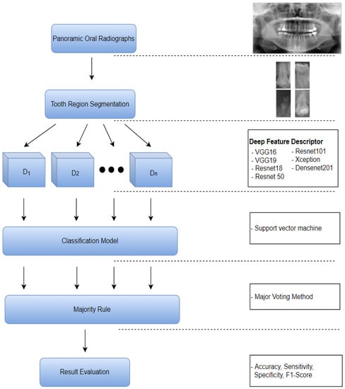 The proposed method, shown in Figure 3, consists of tooth segmentation, tooth feature descriptor, and caries prediction processes. In the first stage, a YOLO model is applied for tooth region proposal. Then, the proposal region is segmented from the image and fed into the feature descriptor. Several pre-trained networks, namely VGG16 [], VGG19 [], Resnet18 [], Resnet50 [], Resnet101 [], Xception [], and Densenet201 [], are used as feature descriptors to extract informative features. Next, the features are used to train an SVM [] classifier. Finally, a majority voting method is applied using the model features to produce the final optimal result.